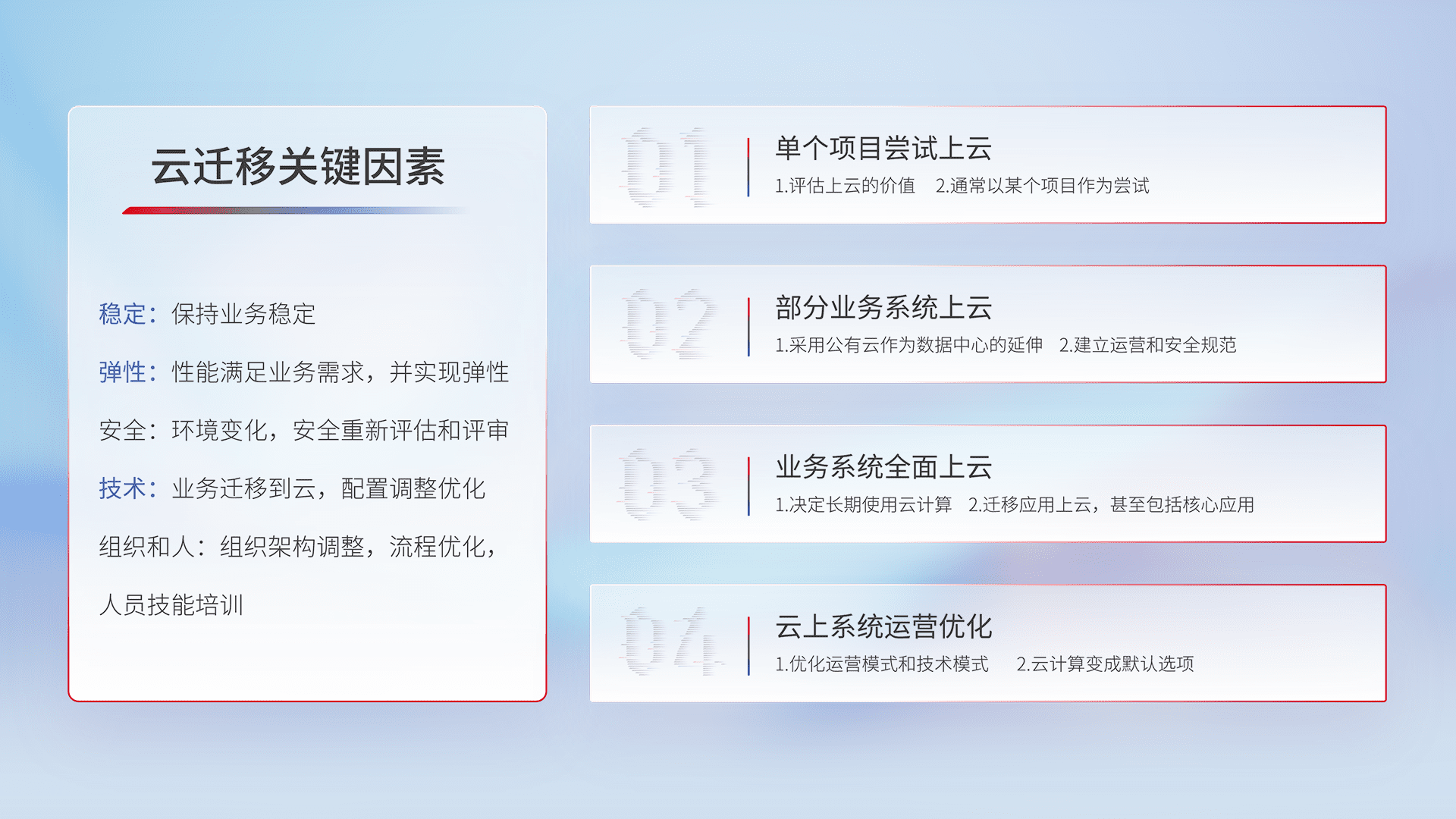 结合实际业务,,,,从规划设计、、、、云平台选型、、、、云原生改造、、、数据迁移、、集成交付,,迁移全过程为客户识别最佳上云路径,,,,做好风险识别管理,,设计网络架构、、、身份权限、、、安全审计合规、、操作审计、、日志审计、、、、监控告警策略、、、多站点容灾设计等,,,,对云上基础设施进行整体规划,,,,提升IT治理水平,,,以满足弹性、、、高可用、、、高性能的需求。。。